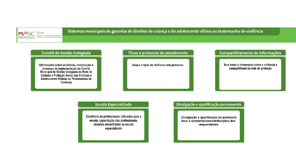 Numa ação parceira entre MPSC (CIJE) e CEDCA/SC, com o apoio da FECAM (Federação Catarinense de Municípios), foi distribuído um formulário a todos os conselhos municipais de direitos da criança e do adolescente para preenchimento mediante discussão do colegiado e de integrantes da rede de proteção que executam o protocolo de atendimento às crianças e adolescentes vítimas e testemunhas de violência.