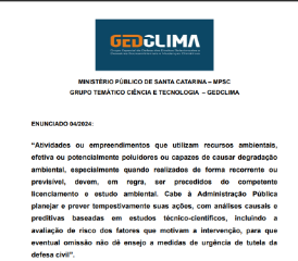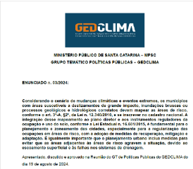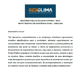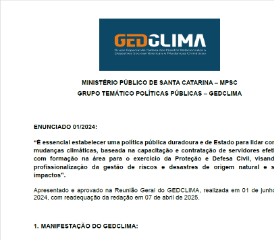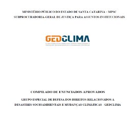 O Grupo Especial de Defesa dos Direitos Relacionados a Desastres Socioambientais e Mudanças Climáticas (GEDCLIMA) tem por objetivo subsidiar a definição de estratégias de atuação para efetivar a defesa dos direitos relacionados a desastres socioambientais e mudanças climáticas em SC. O grupo também prestará apoio técnico e jurídicos a Promotores e Procuradores de Justiça em casos dessa natureza. (Ato n. 17/2024/PGJ)