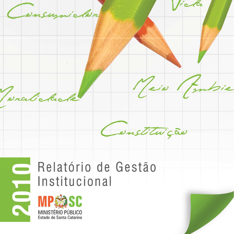 O Ministério Público de Santa Catarina apresenta o relatório de gestão das atividades, dos projetos e dos programas relativos ao ano de 2010, como forma de prestação de contas à sociedade das ações empreendidas para o cumprimento das missões institucionais. No plano das relações institucionais com a sociedade e os Poderes e órgãos, o Ministério Público pautou-se nos valores da independência, lealdade, ética, legalidade, efetividade, moralidade, solidariedade, harmonia, transparência, justiça e confiança.