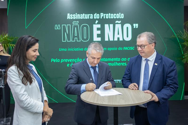 O Ministério Público de Santa Catarina (MPSC) e a Federação das Associações Empresariais de Santa Catarina (FACISC) realizaram, na terça-feira (18/11), um evento que marcou a assinatura oficial do Protocolo “Não é Não”. A assinatura aconteceu no auditório da FACISC e contou com a presença de empresários, lideranças estaduais e representantes de instituições públicas. Durante o evento aconteceu o lançamento da campanha “Aqui não”, que será promovida pelo MPSC e pela FACISC e contará com o apoio do projeto Antonietas e do Governo do Estado de Santa Catarina.