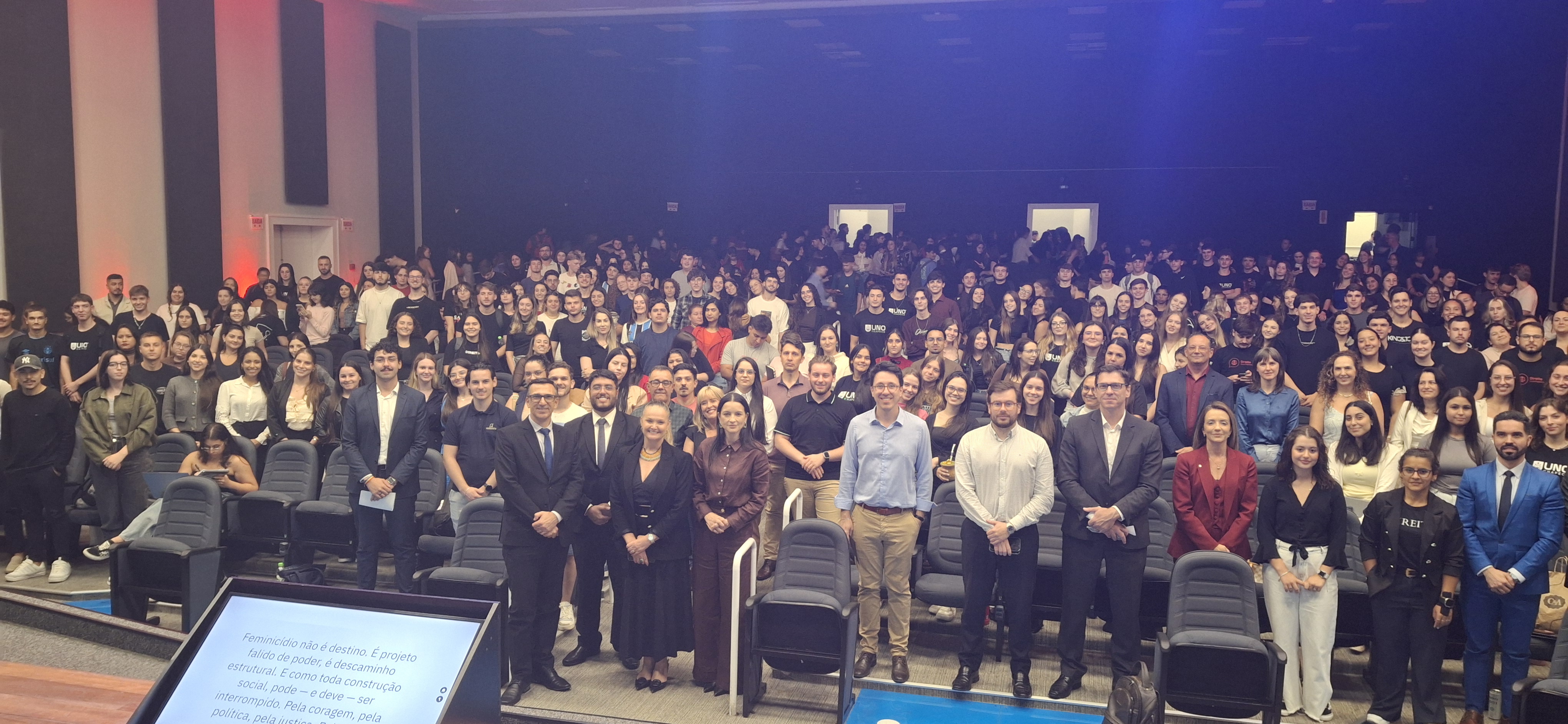 PGJ Vanessa Wendhausen Cavallazzi lota o Salão Nobre da Unochapecó em aula sobre o desafio estrutural do enfrentamento à violência contra a mulher