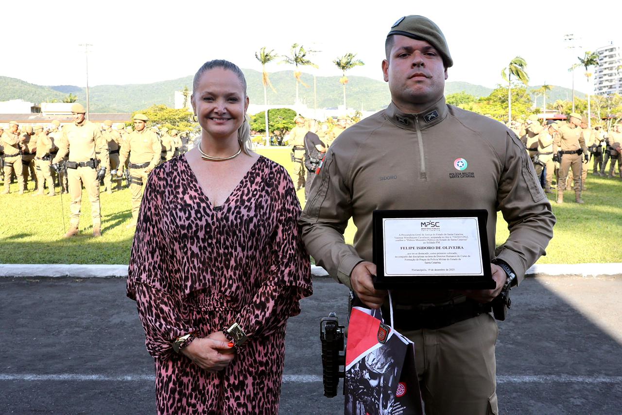 A Procuradora-Geral de Justiça, Vanessa Wendhausen Cavallazzi, entregou na tarde desta sexta-feira o Prêmio Ministério Público do Estado de Santa Catarina ao soldado PM Felipe Isidoro de Oliveira, reconhecido por ter sido o primeiro colocado nas disciplinas de Direitos Humanos do Curso de Formação de Praças 2025.