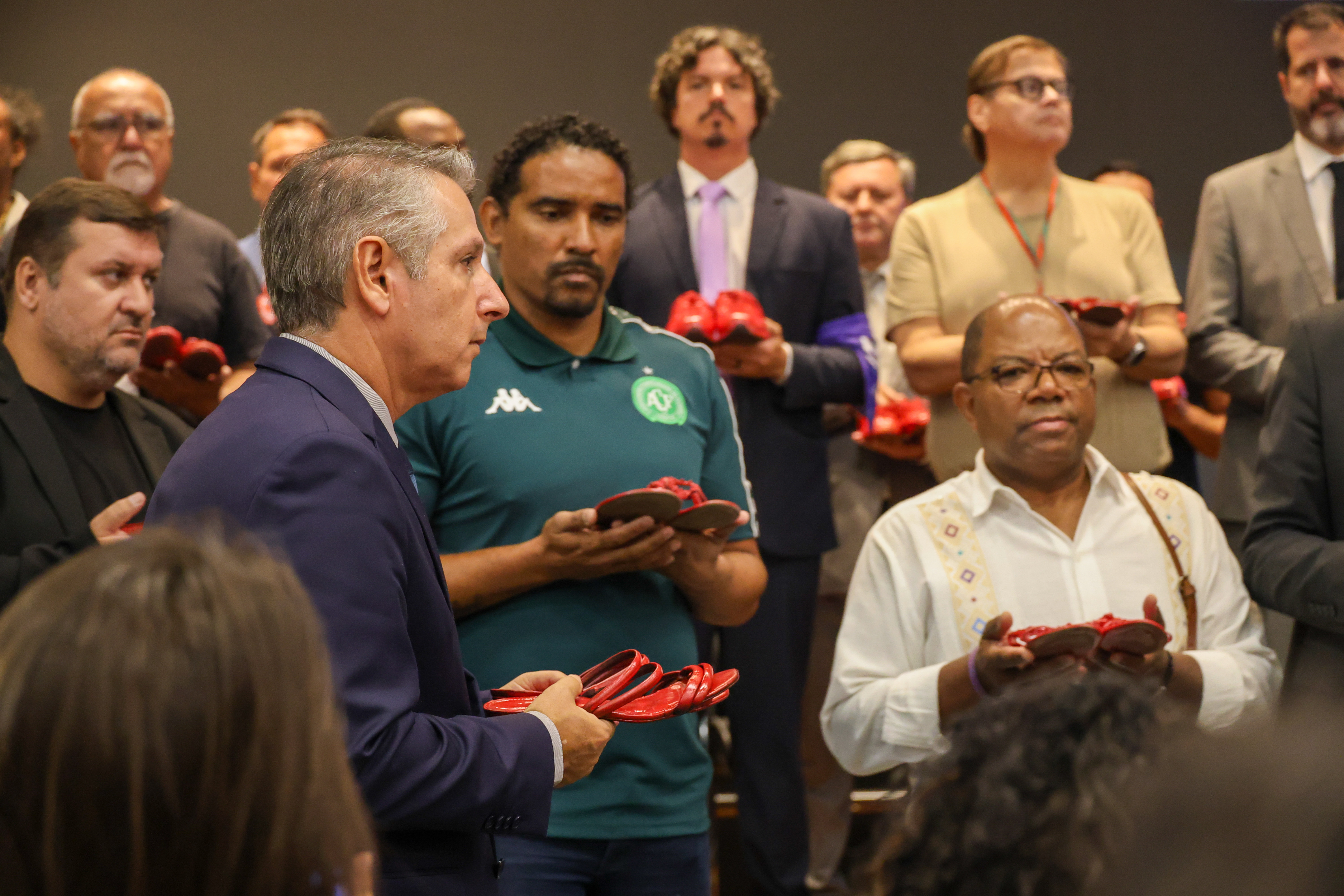 No começo, 52 homens entraram no auditório carregando um par de sapatos vermelhos, simbolizando as mulheres vítimas de feminicídio em Santa Catarina em 2025. No telão, foram projetados os nomes, idades e municípios em que foram mortas. Pelo MPSC, participou do ato o Subprocurador-Geral de Justiça para Assuntos Institucionais, Andrey Cunha Amorim. Ao centro do palco foi estendida uma faixa com a mensagem “A culpa não foi delas”.