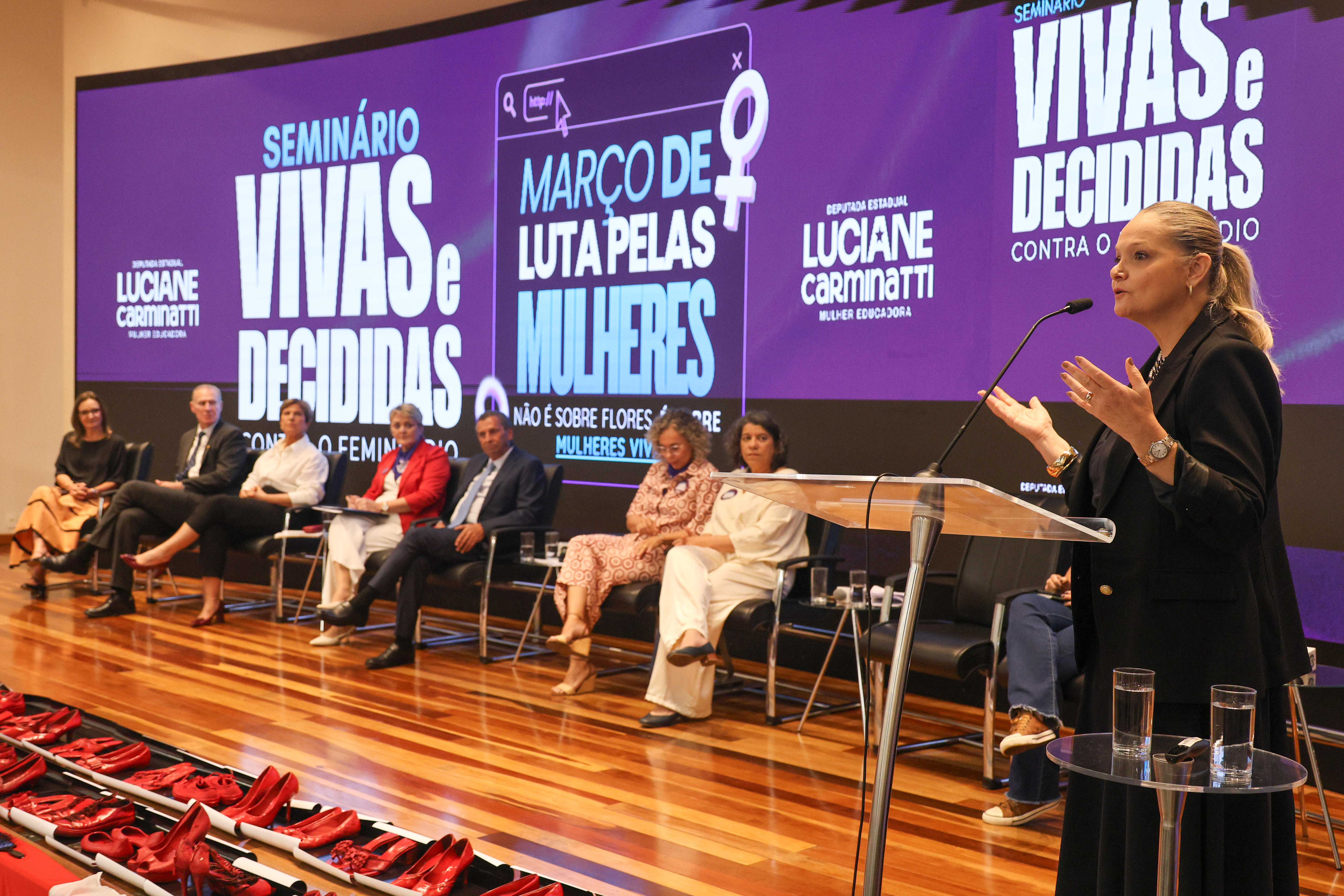 A Procuradora-Geral de Justiça do Ministério Público de Santa Catarina (MPSC), Vanessa Wendhausen Cavallazzi, concluiu sua participação no seminário “Vivas e decididas contra o feminicídio” na manhã desta quinta-feira (5/3) na Assembleia Legislativa de Santa Catarina (ALESC), convocando instituições públicas e a sociedade a fortalecerem um pacto coletivo no enfrentamento à violência contra as mulheres. No mesmo ato, ela assinou um termo de compromisso entre os Poderes pela vida das mulheres em Santa Catarina. O evento ocorreu no Auditório Antonieta de Barros, da ALESC, em Florianópolis.