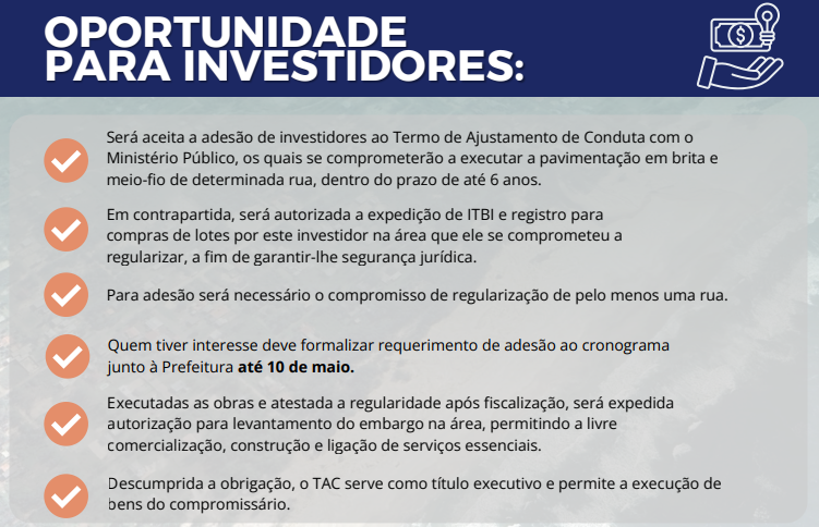 Também será permitida a adesão de investidores ao TAC. Nesse caso, eles poderão assumir a execução da pavimentação em brita e meio-fio de determinadas ruas, no prazo de até seis anos. Como contrapartida, será autorizada a expedição de ITBI e o registro de compras de lotes nas áreas regularizadas pelo próprio investidor, garantindo segurança jurídica às transações.