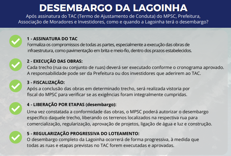 Enquanto a regularização não for concluída, permanece proibida a venda ou negociação de lotes no Loteamento Lagoinhas. A restrição decorre de decisão liminar obtida na ação ajuizada pelo Ministério Público e tem como objetivo evitar prejuízos a novos compradores e o agravamento da irregularidade urbanística.