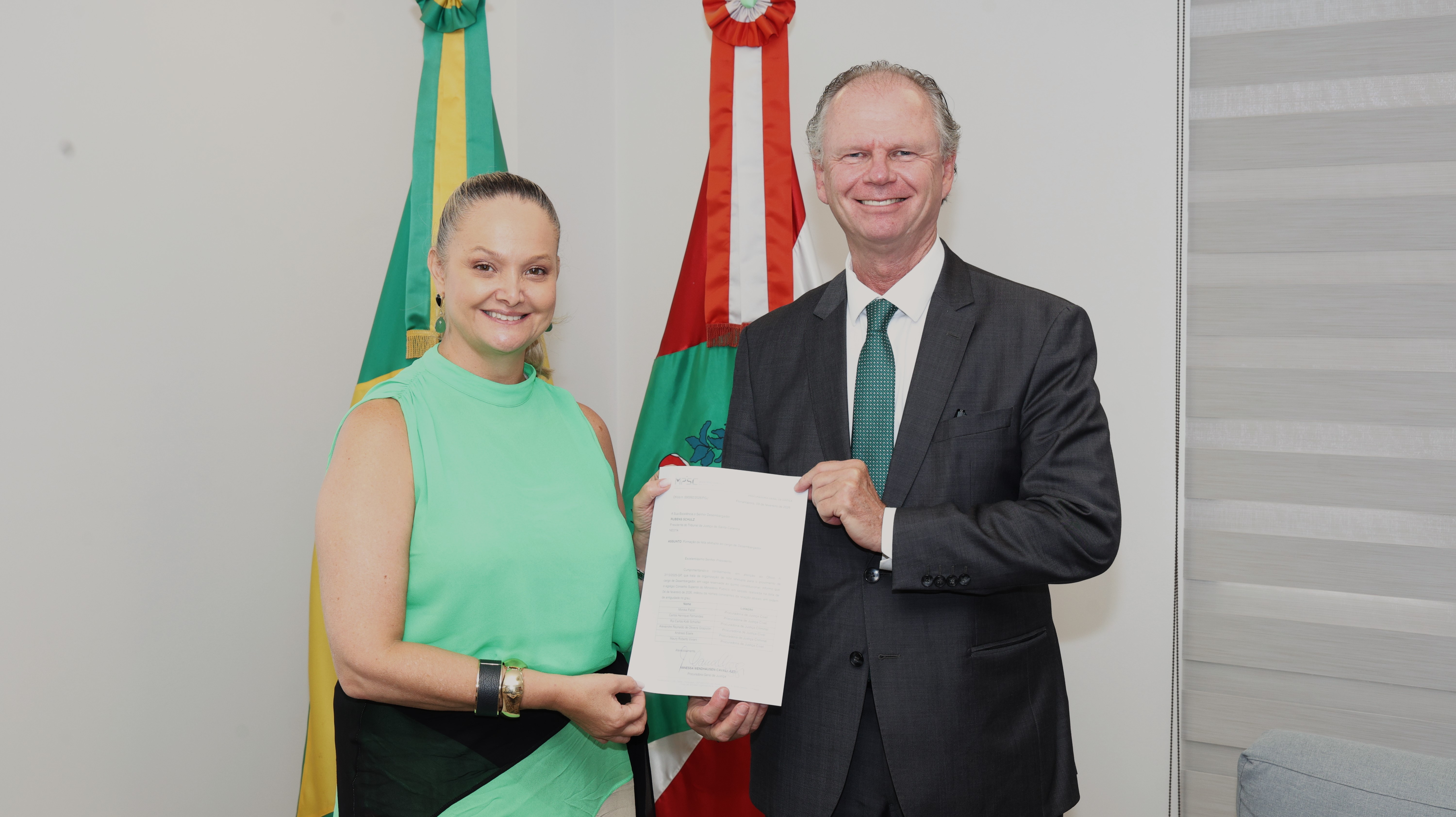 Os nomes que integram a lista sêxtupla escolhida pelo Conselho Superior do Ministério Público (CSMP) para o cargo de Desembargador foram oficialmente entregues ao Tribunal de Justiça de Santa Catarina (TJSC) nesta segunda-feira (9/2). O documento com a lista foi entregue pela Procuradora-Geral de Justiça, Vanessa Wendhausen Cavallazzi, ao Presidente do Tribunal, Rubens Schulz.