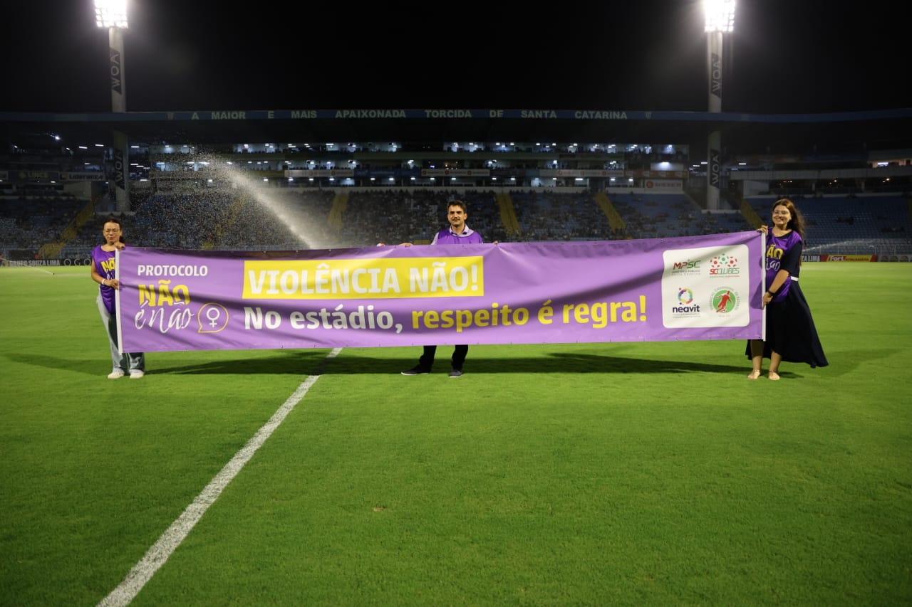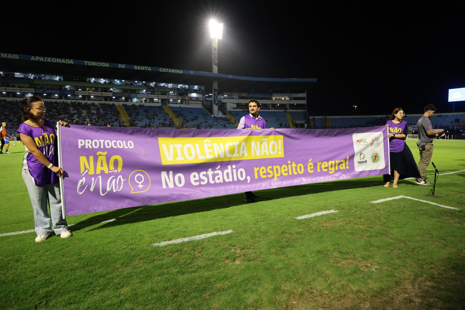 Faixa exibida na abertura de Avaí e Barra marca início da aplicação da política de prevenção à violência contra mulheres nos estádios de Santa Catarina.