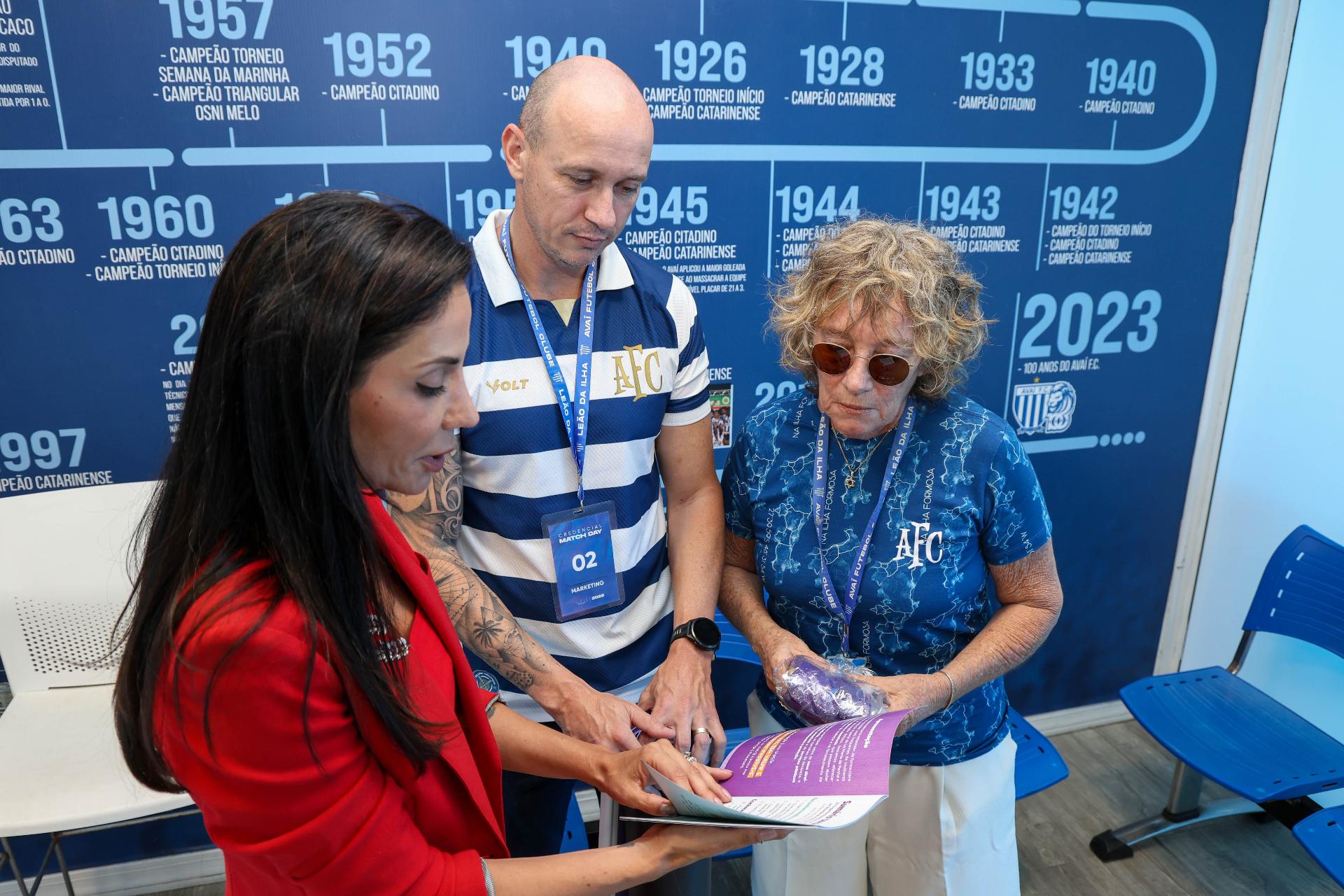“A abertura de hoje é o pontapé inicial para conseguirmos contornar algumas estatísticas nos campos de futebol”, disse a Coordenadora-Geral do Núcleo de Enfrentamento a Violências e Apoio às Vítimas (NEAVIT), Promotora de Justiça Chimelly Louise de Resenes Marcon, ao entregar a faixa do protocolo “Não é não” para a Diretora de Relacionamento com os Torcedores do Avaí, Kaká de Paula, e o Gerente de Marketing, Thiago Pravatto. A faixa será exibida na abertura do jogo entre o Avaí e o Barra nesta quarta-feira (7/1) e marca a primeira ação do protocolo nos campos de futebol.