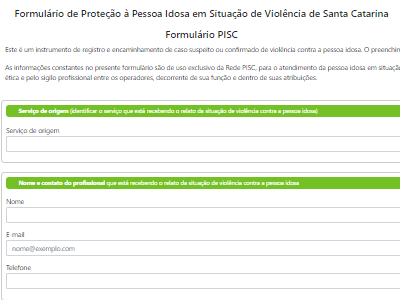 - Elaboração de Formulário de Proteção à Pessoa Idosa em Situação de Violência de Santa Catarina (Formulário PISC) e de campanha referente à violência contra idosos veiculada nas redes sociais;