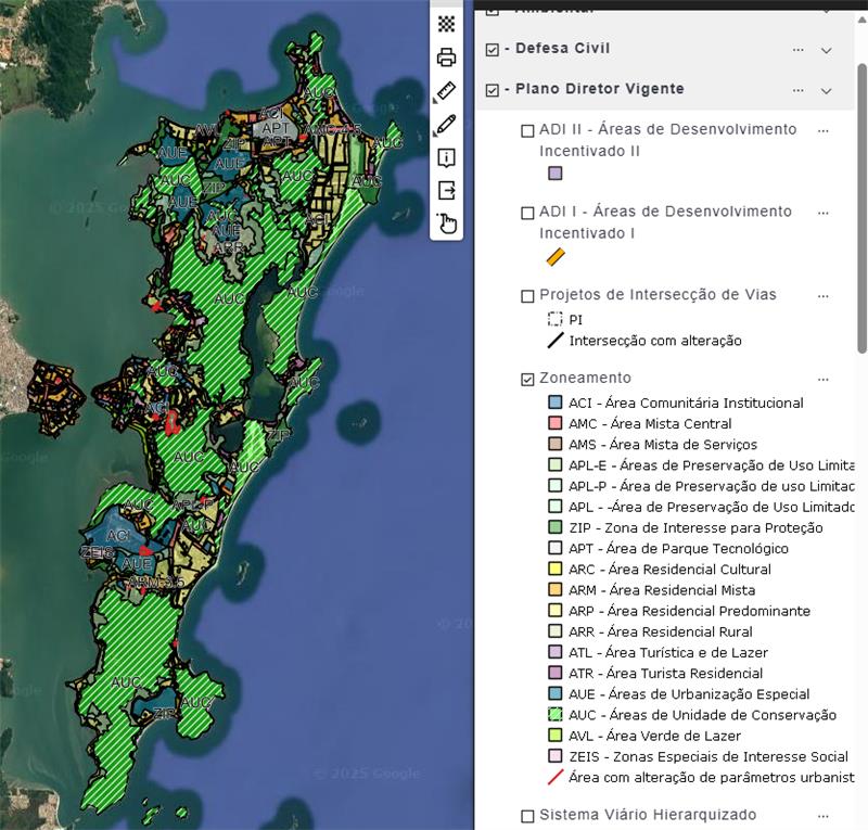 O documento reafirma os princípios constitucionais de proteção ambiental previstos no artigo 225 da Constituição Federal, a regência do Sistema Nacional de Unidades de Conservação (Lei n. 9.985/2000), que exige lei específica para desafetação ou redução de limites. No caso, como o Plano Diretor de Florianópolis (LC n. 482/2014, com alterações da LC n. 739/2023) reconhece e zoneia as UCs como áreas de unidade de conservação (AUC), qualquer alteração também deve cumprir as diretrizes do Estatuto da Cidade (Lei n. 10.257/2001), que determina a realização de audiências públicas e debates com participação da população e entidades da sociedade civil para discutir as propostas. O zoneamento municipal vigente está disponível no Geoportal da Prefeitura de Florianópolis.