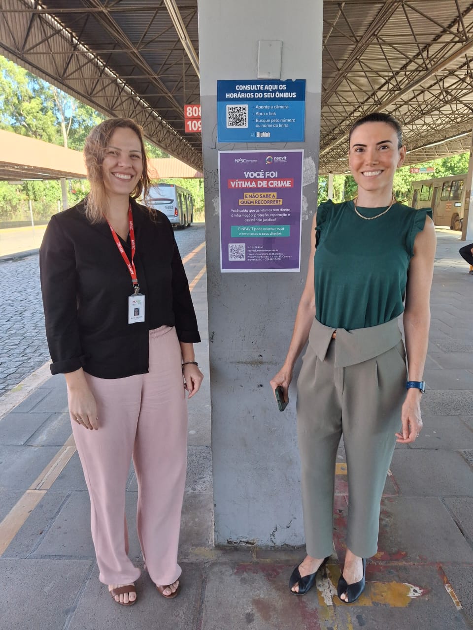 MPSC visitou terminais de ônibus da cidade, colando cartazes e distribuindo materiais informativos aos usuários do transporte público, com orientações sobre os serviços prestados pelo Núcleo de Enfrentamento a Violências e Apoio às Vítimas (NEAVIT) de Blumenau.