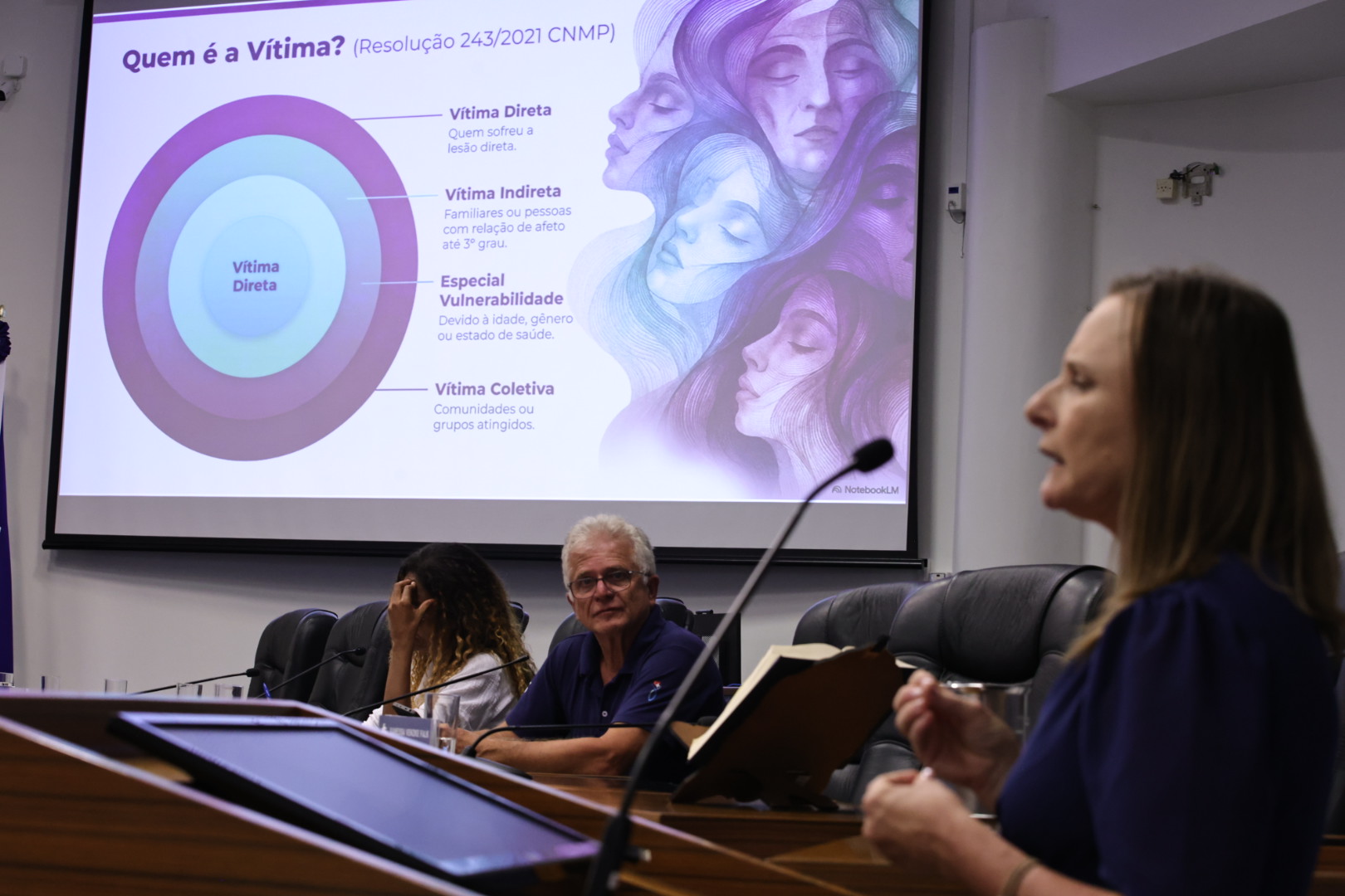 O início da apresentação foi centrado no compartilhamento de dados sobre o perfil de vítimas e de autores de feminicídio em Santa Catarina. As informações foram apontadas por meio do Mapa do Feminicídio, elaborado pelo Ministério Público de Santa Catarina (MPSC). Para conferir os dados completos, clique aqui https://www.mpsc.mp.br/mapa-feminicidio