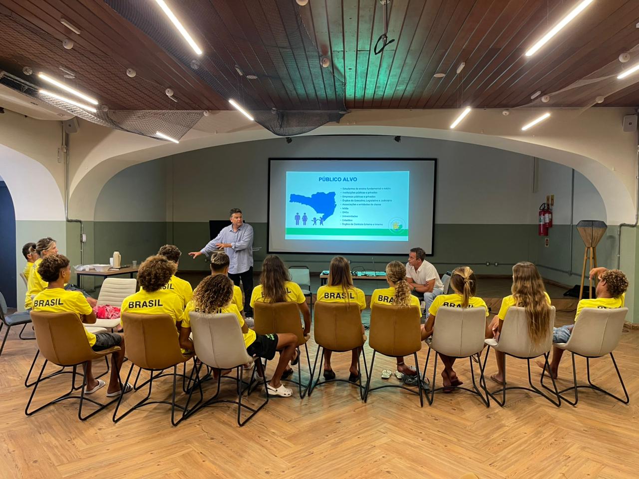 De passagem por Florianópolis e em meio aos treinos e orientações técnicas, a equipe de atletas da seleção brasileira de surfe júnior participou de um evento voltado ao combate à corrupção nesta segunda-feira (30/3). A iniciativa foi organizada por meio de uma parceria entre o programa Educando Cidadãos, coordenado pelo Ministério Público de Santa Catarina (MPSC), e a Confederação Brasileira de Surfe (Surf Brasil). O objetivo do evento foi unir discussões sobre educação, cidadania e esporte de alto rendimento, além de contribuir para a formação integral dos jovens atletas brasileiros.