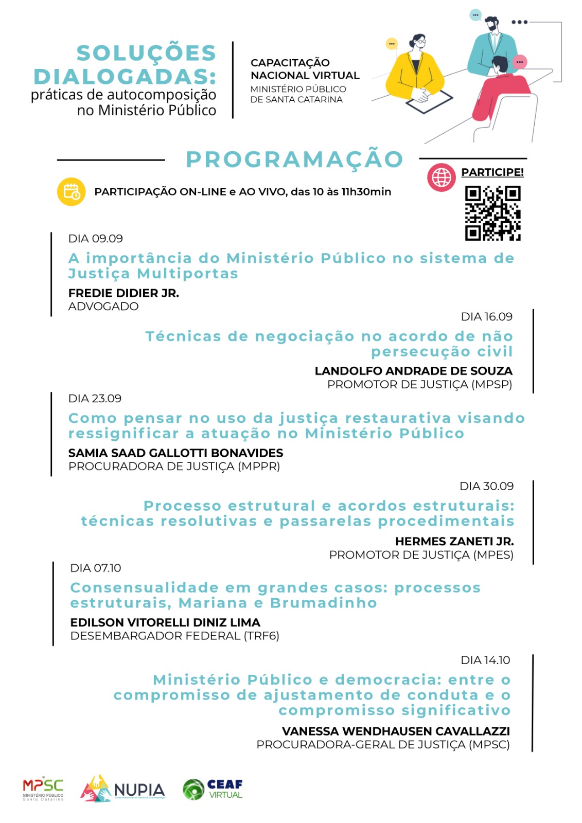 O ciclo nacional de capacitação “Soluções dialogadas – Práticas de autocomposição no Ministério Público” chega ao seu último encontro nesta terça-feira, 14 de outubro, com a participação da Procuradora-Geral de Justiça do Ministério Público de Santa Catarina (MPSC), Vanessa Wendhausen Cavallazzi.