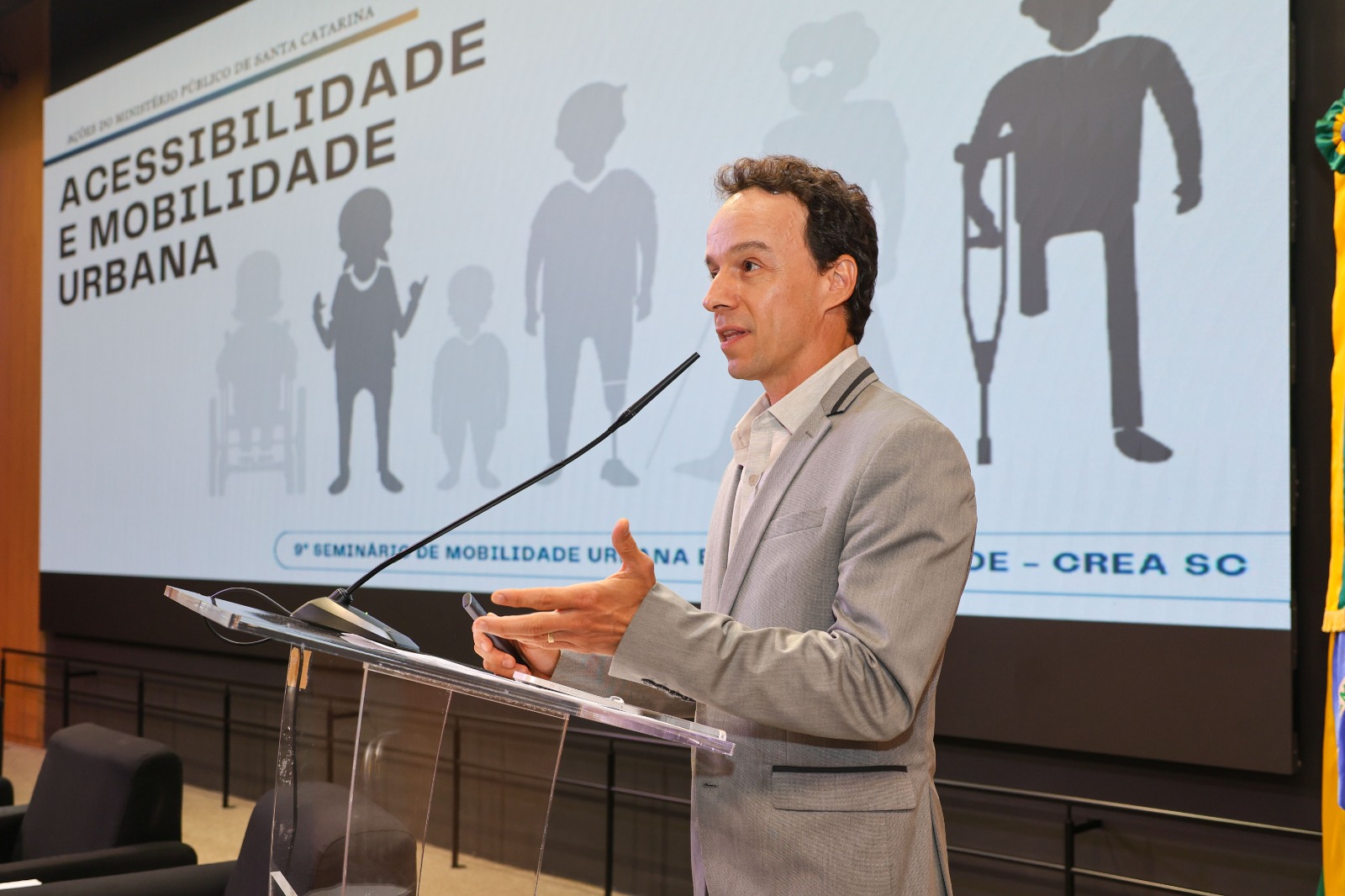 Na manhã desta quarta-feira (5/11), o Coordenador do Centro de Apoio Operacional dos Direitos Humanos e Terceiro Setor (CDH) e do Centro de Apoio Operacional da Saúde Pública (CSP) do Ministério Público de Santa Catarina (MPSC), Promotor de Justiça Eduardo Sens dos Santos, foi um dos palestrantes do 9º Seminário de Mobilidade Urbana e Acessibilidade e do 1º Seminário Nacional de Acessibilidade, realizados pelo Conselho Regional de Engenharia e Agronomia do Estado de Santa Catarina (CREA-SC). O evento ocorreu no auditório da Procuradoria-Geral de Justiça, em Florianópolis.