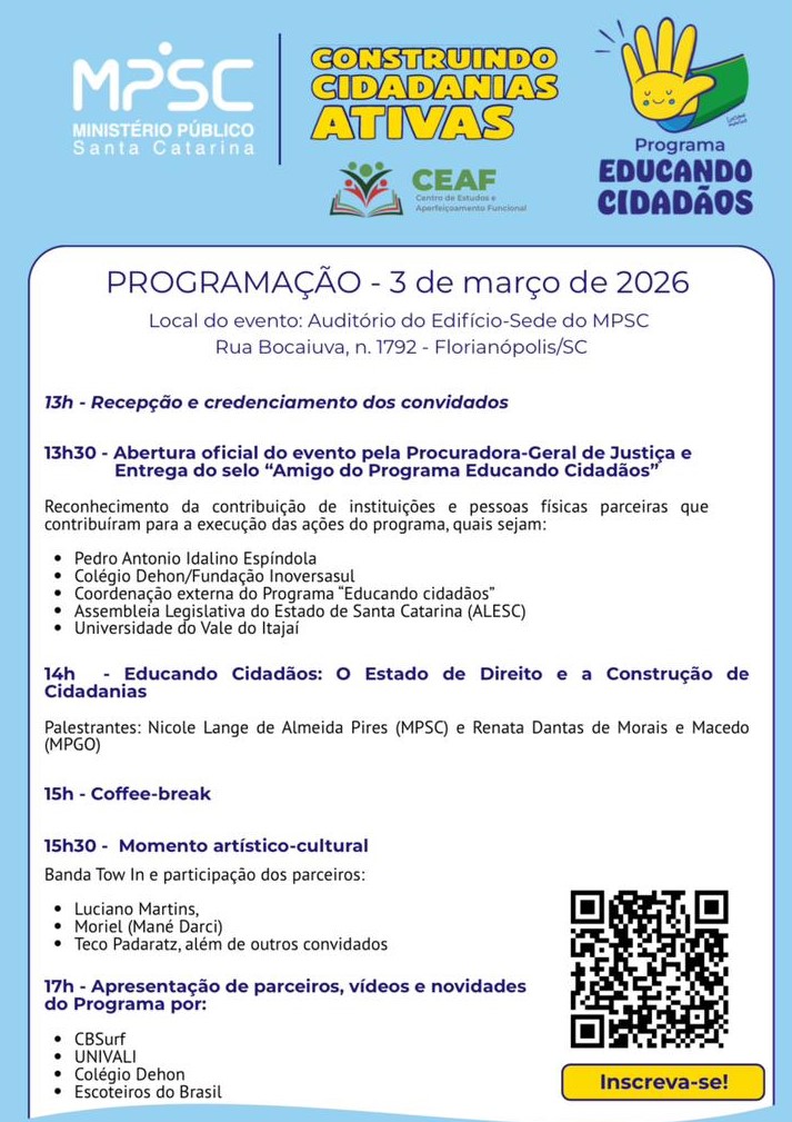 Institucionalizado no MPSC em 2025, o programa promove ações educativas voltadas para o fortalecimento da cidadania, da democracia e dos valores constitucionais.
