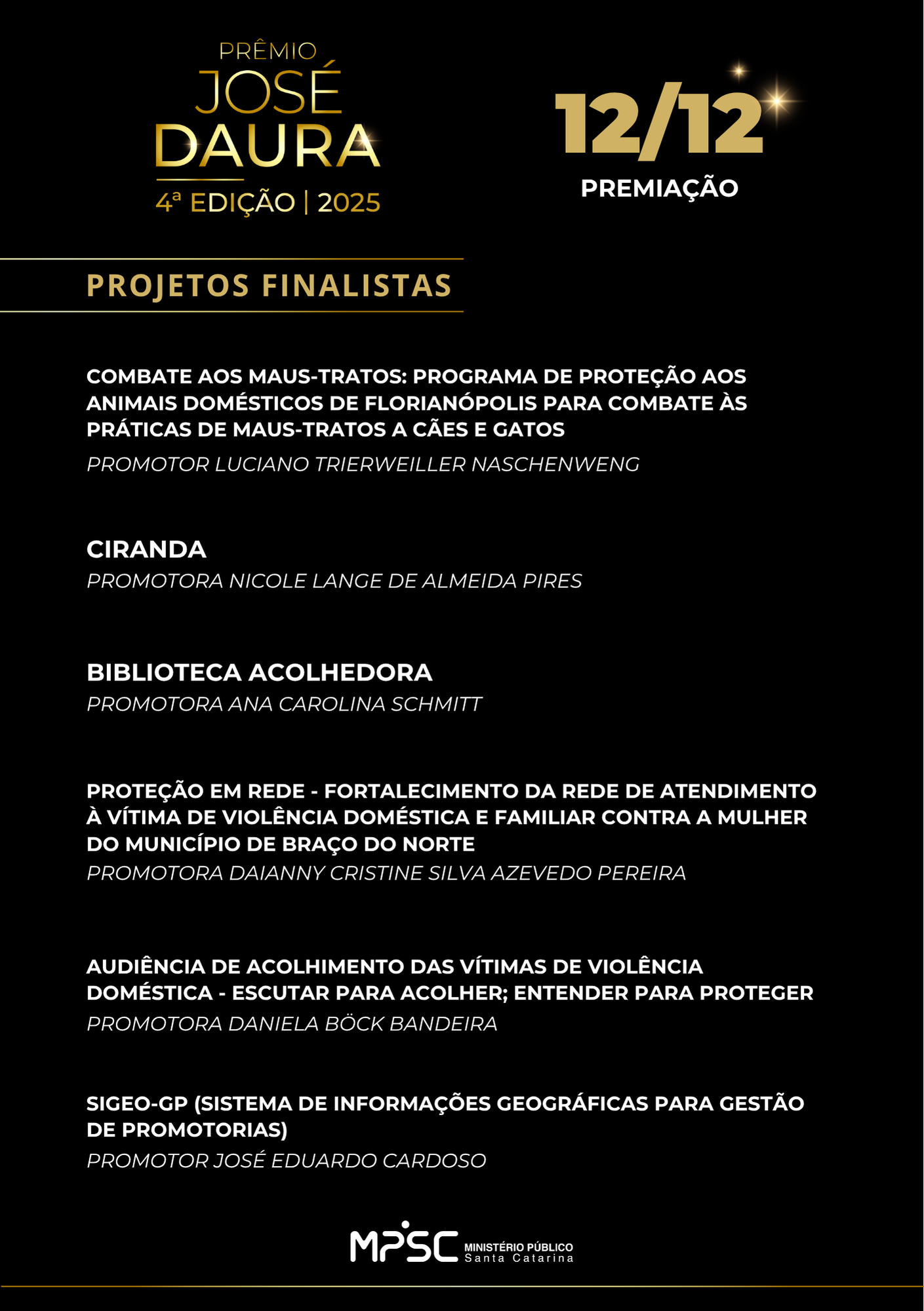 Estamos há um mês da cerimônia de premiação da 4ª edição do Prêmio José Daura! Neste ano concorrerão ao prêmio seis projetos capitaneados por Promotorias de Justiça das comarcas: Capital, Itá, Turvo, Braço do Norte, São José do Cedro e Palhoça. As iniciativas foram habilitadas pelo programa Transformação MP, com resultados comprovados nos últimos 12 meses. Confira: