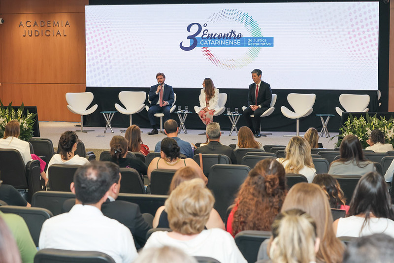 Três integrantes do Ministério Púbico de Santa Catarina (MPSC) participaram do segundo dia do 3º Encontro Catarinense de Justiça Restaurativa nesta sexta-feira (28/11). A Procuradora-Geral de Justiça, Vanessa Wendhausen Cavallazzi, o Coordenador do Núcleo Permanente de Incentivo à Autocomposição (NUPIA), Promotor de Justiça Marco Aurélio Morosini, e a Promotora de Justiça Iara Klock Campos compartilharam perspectivas sobre a implementação da Justiça Restaurativa em Santa Catarina.