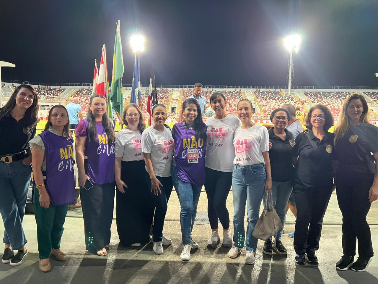 A entrada dos jogadores em campo na partida entre Joinville e CSA pela Copa do Brasil foi diferenciada. Nesta terça-feira (24/2), a faixa do protocolo “Não É Não” foi carregada por 10 mulheres na Arena Joinville. Elas representam instituições como o Ministério Público de Santa Catarina (MPSC), a Polícia Civil e a Ordem dos Advogados do Brasil, por meio da OAB Por Elas. A iniciativa fomenta a conscientização sobre a importância do combate à violência contra a mulher em estádios de futebol e oferece acolhimento para as vítimas.