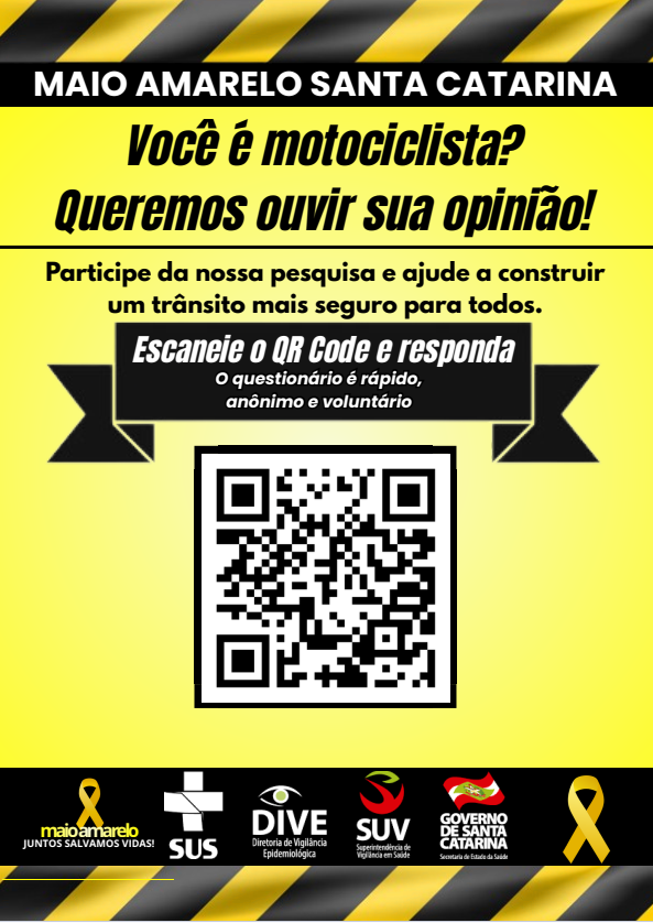 Em alusão ao Maio Amarelo, mês de conscientização sobre acidentes de trânsito, o Ministério Público de Santa Catarina apoia a divulgação do questionário elaborado pela Diretoria de Vigilância Epidemiológica. Os resultados serão utilizados para o planejamento ações e estratégias de prevenção da violência no trânsito.