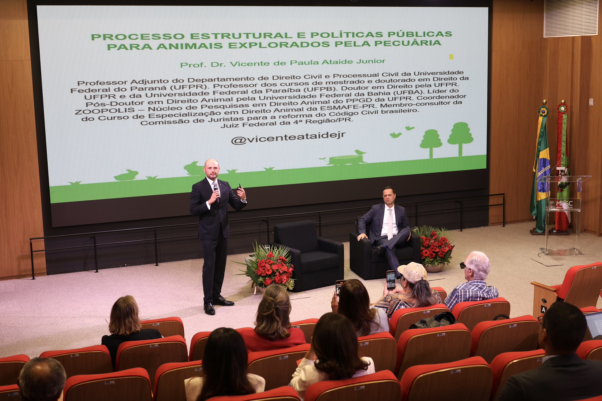 A primeira palestra do seminário foi ministrada pelo Juiz Federal Vicente de Paula Ataíde Junior, professor e doutor em Direito pela Universidade Federal do Paraná e membro consultor da Comissão de Juristas para a Reforma do Código Civil. Ele cumprimentou a Promotora de Justiça Simone Schultz pelo trabalho na proteção animal e o compromisso do MPSC com a consolidação do Direito Animal, reconhecendo animais como sujeitos de direitos e não meros bens ambientais. Ressaltou, ainda, a vanguarda institucional do MPSC ao incluir a disciplina de Direito Animal no concurso para novos membros.