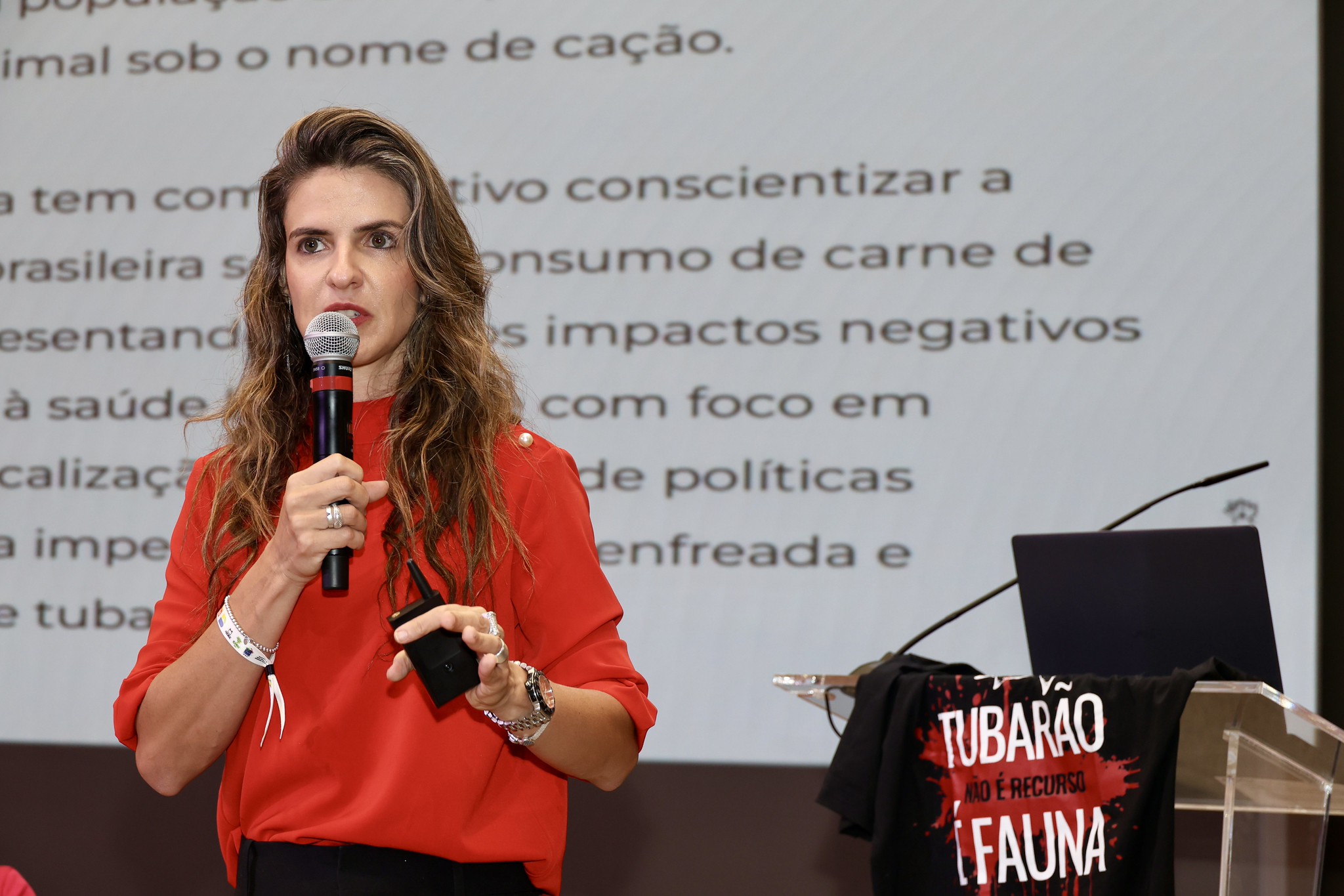 Para encerrar o ciclo de palestras da manhã, a advogada e professora do Sea Shepherd Brasil, Fernanda Perregil, apresentou o painel “Políticas públicas para animais aquáticos”. Com o tema “Cação é Tubarão”, ela abordou problemas estruturais contemporâneos do ecossistema marinho. Um deles é a compra pública de carne de cação, nome dado a espécies como tubarão e raias.