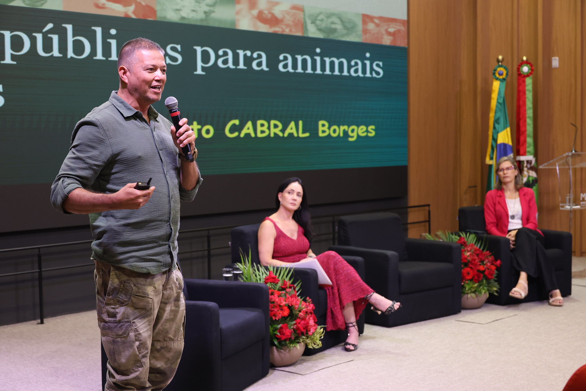 Na sequência, o agente ambiental do Instituto Brasileiro do Meio Ambiente e dos Recursos Naturais Renováveis (IBAMA) Roberto Cabral abordou a temática “Políticas públicas para animais silvestres”. Ele mencionou a falta de uma política nacional para animais silvestres e apresentou soluções para chegar ao caminho desejado. Roberto também enfatizou a relevância da realização de um evento que trate da temática dos direitos dos animais no Ministério Público.