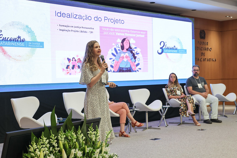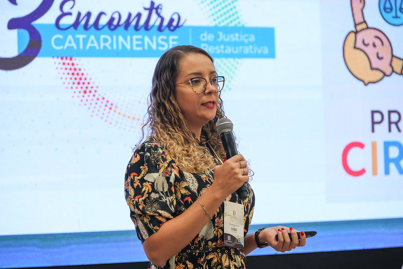 À tarde, o evento retomou com o painel “Justiça Restaurativa em Ação: Experiências do Grupo Gestor em Santa Catarina”, que contou com a participação de duas Promotoras de Justiça. A integrante do MPSC Andréia Tonin apresentou o histórico de criação do projeto Florescer, que busca aplicar conceitos da justiça restaurativa no âmbito do combate à violência contra a mulher. Com a iniciativa busca-se a redução nos índices de violência doméstica nas cidades de Fraiburgo e Monte Carlo e o fortalecimento da confiança das vítimas nas instituições de proteção e justiça. A primeira fase do projeto abordou a aquisição de fundos para a capacitação de voluntários. Eles aprenderam técnicas de escuta ativa, mediação de conflitos e atendimento humanizado para conduzir os círculos de construção de paz. “Depois de tudo organizado, a realidade nos mostrou que o maior desafio seria a participação das mulheres. Mesmo que nós não tenhamos conseguido atingir tantas mulheres como o nosso sonho previa, quem foi atingido, saiu melhor. O projeto Florescer ainda não conseguiu ser um campo florido, mas ele já deixa o seu perfume”, ressalta. Atualmente, o projeto está sendo reformulado pela atual Promotora de Justiça da Comarca de Fraiburgo, Fernanda de Ávila Moukarzel.