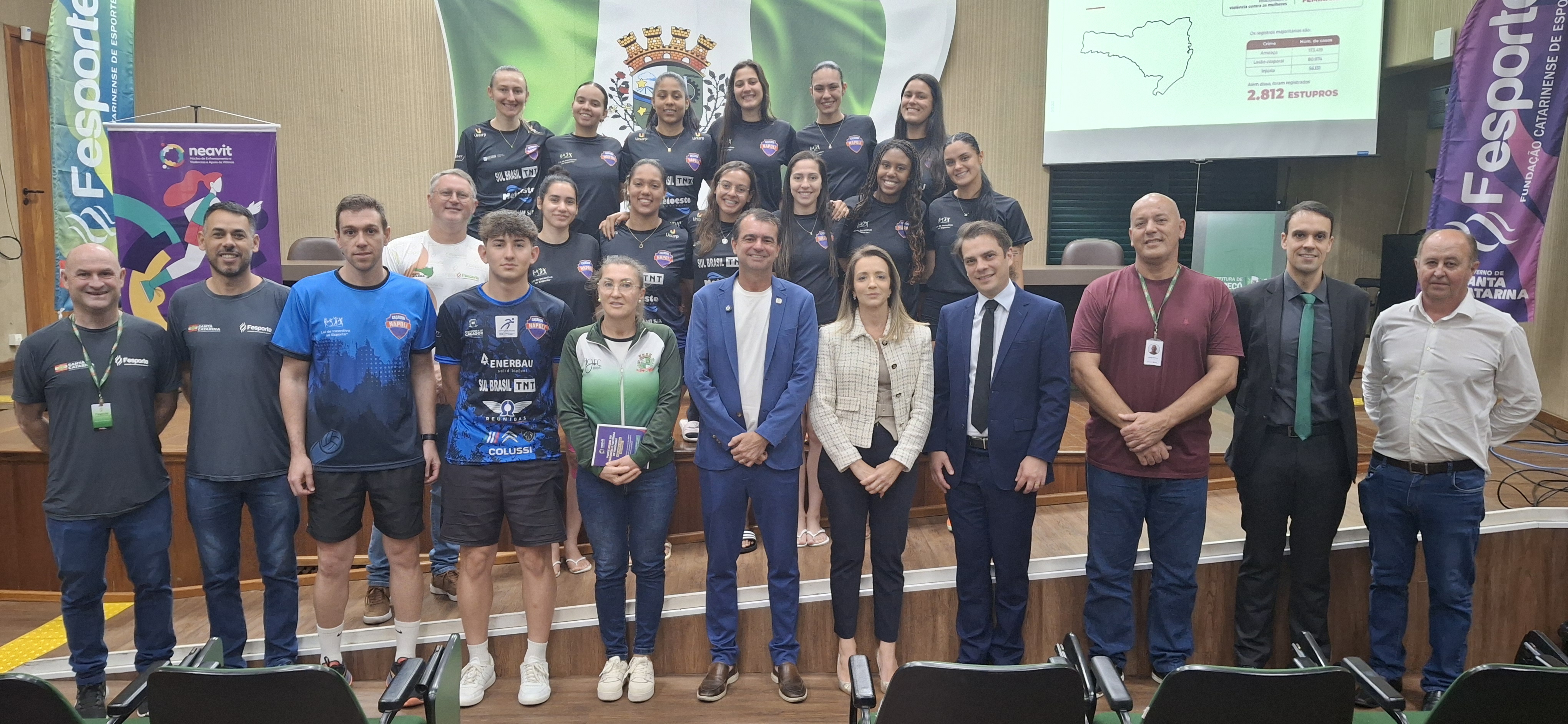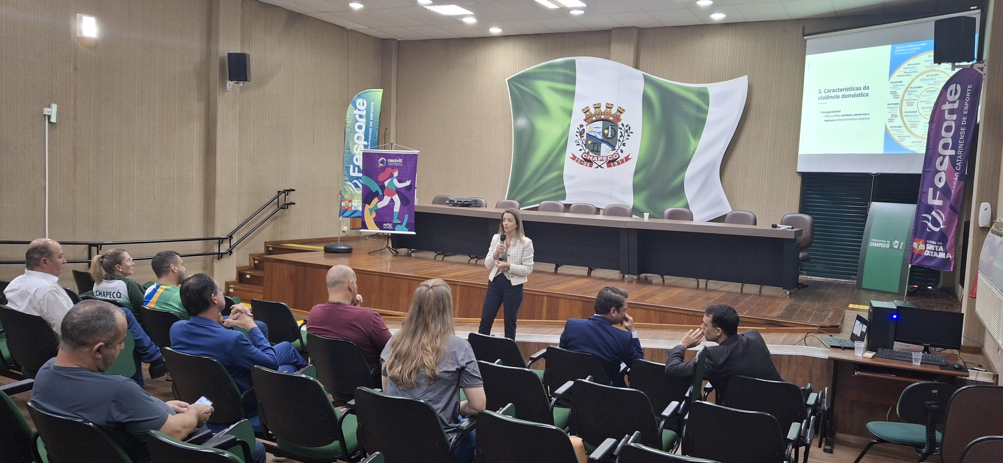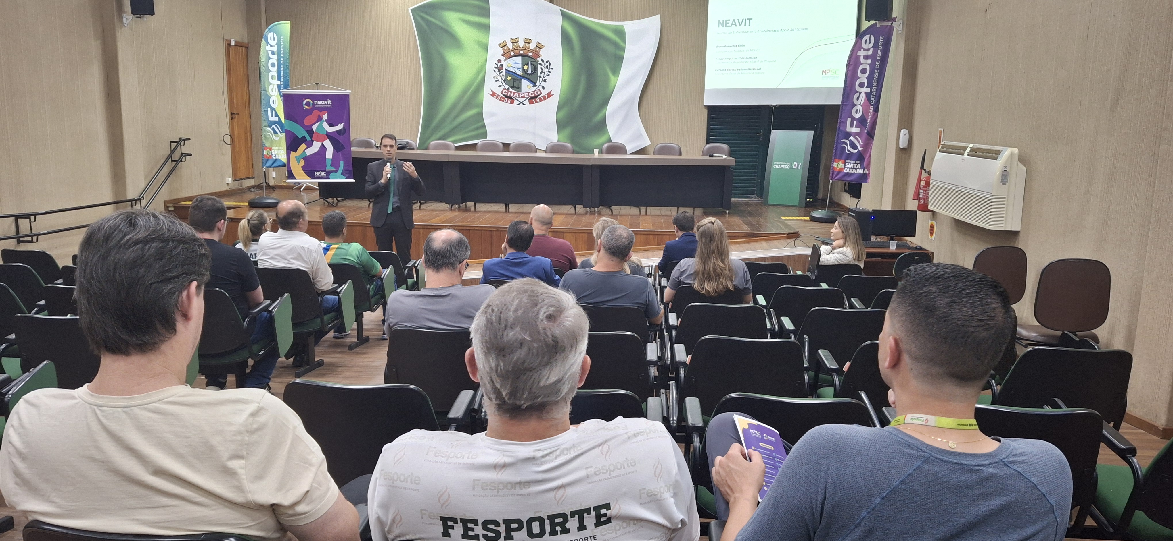 Em Chapecó, nesta terça-feira (25/11), o Ministério Público de Santa Catarina (MPSC), por meio do Núcleo de Enfrentamento a Violências e Apoio às Vítimas (NEAVIT), promoveu um debate que integrou a programação dos Jogos Abertos de Santa Catarina (Jasc). No evento, Promotores de Justiça apresentaram a atuação do NEAVIT para dirigentes, técnicos, árbitros e atletas que se reuniram no auditório da Prefeitura de Chapecó. O município sedia a 64ª edição do Jasc, que se iniciou em 18 de novembro e se estende até o próximo sábado (29).