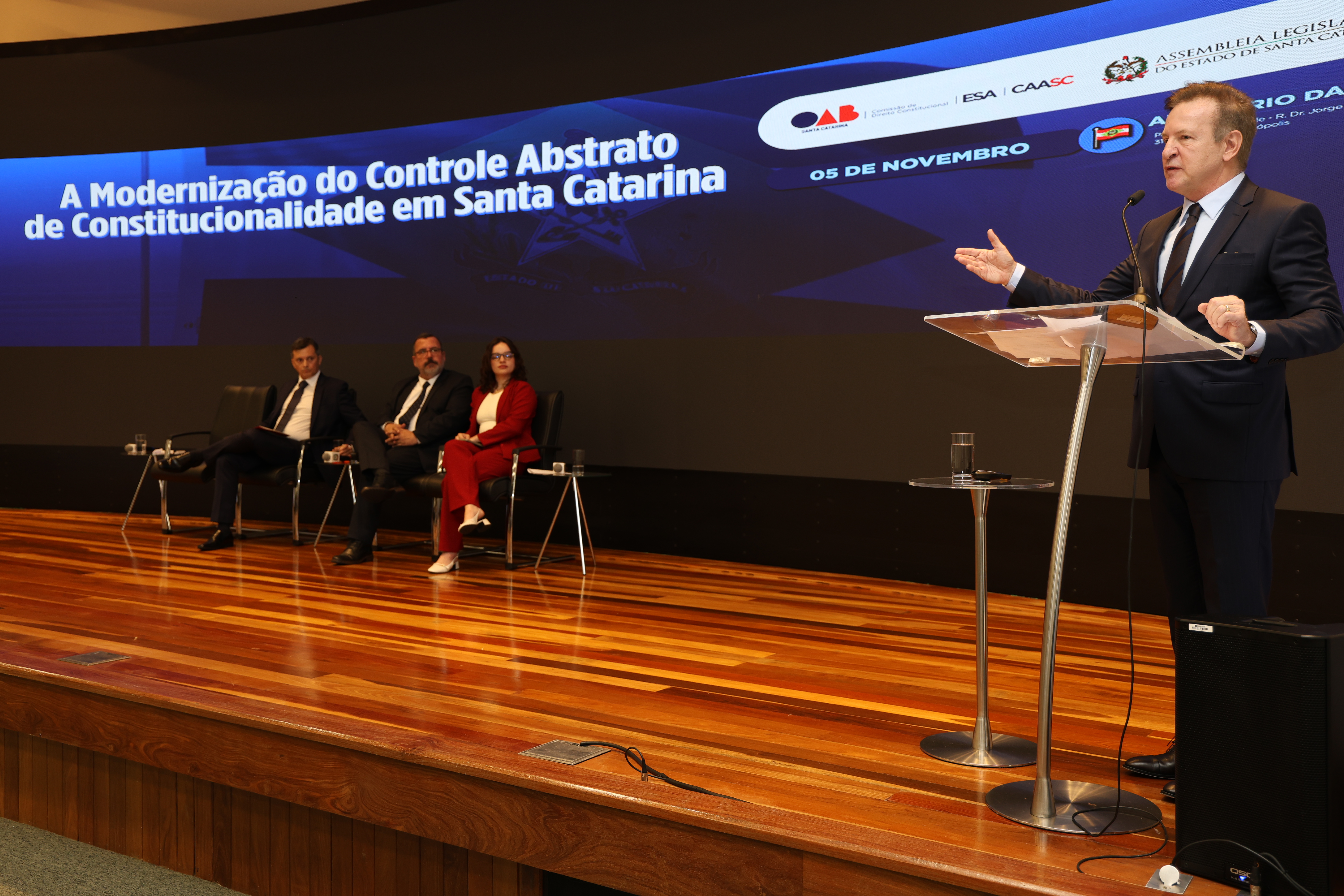 Promovido com o objetivo de debater o futuro do controle da constitucionalidade em Santa Catarina, o evento reuniu representantes de instituições, juristas e especialistas no tema, parlamentares e acadêmicos. O foco do seminário, realizado por meio da Comissão de Constituição e Justiça da ALESC e da Comissão de Direito Constitucional da Ordem dos Advogados do Brasil em Santa Catarina (OAB/SC), foi o Projeto de Lei n. 0306/2025, de autoria do Deputado Napoleão Bernardes (PSD), que dispõe sobre o procedimento e julgamento das ações de controle concentrado de constitucionalidade no âmbito do Tribunal de Justiça de Santa Catarina, além da PEC n. 005/2025, que complementa a reforma do sistema estadual de controle constitucional.