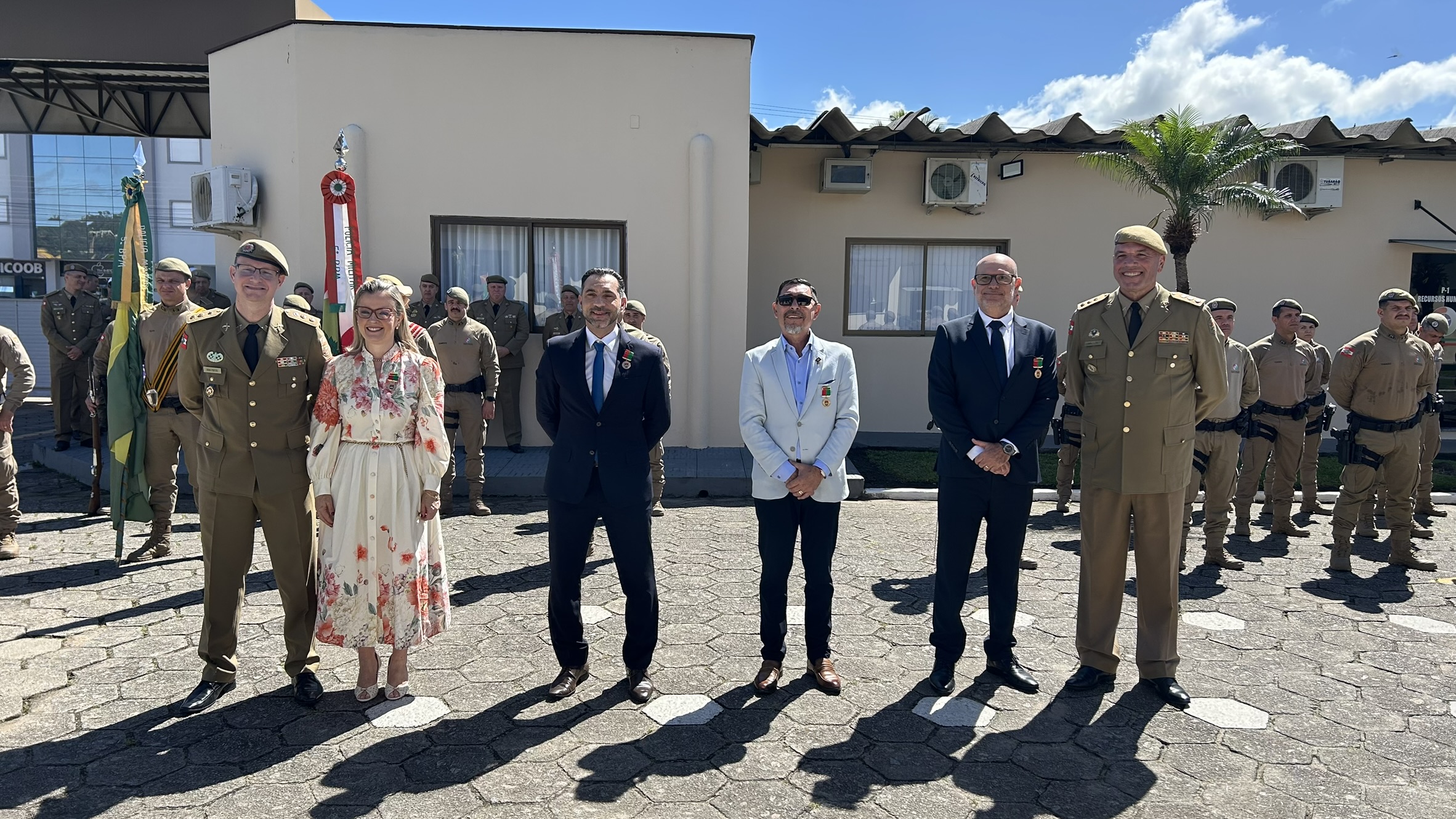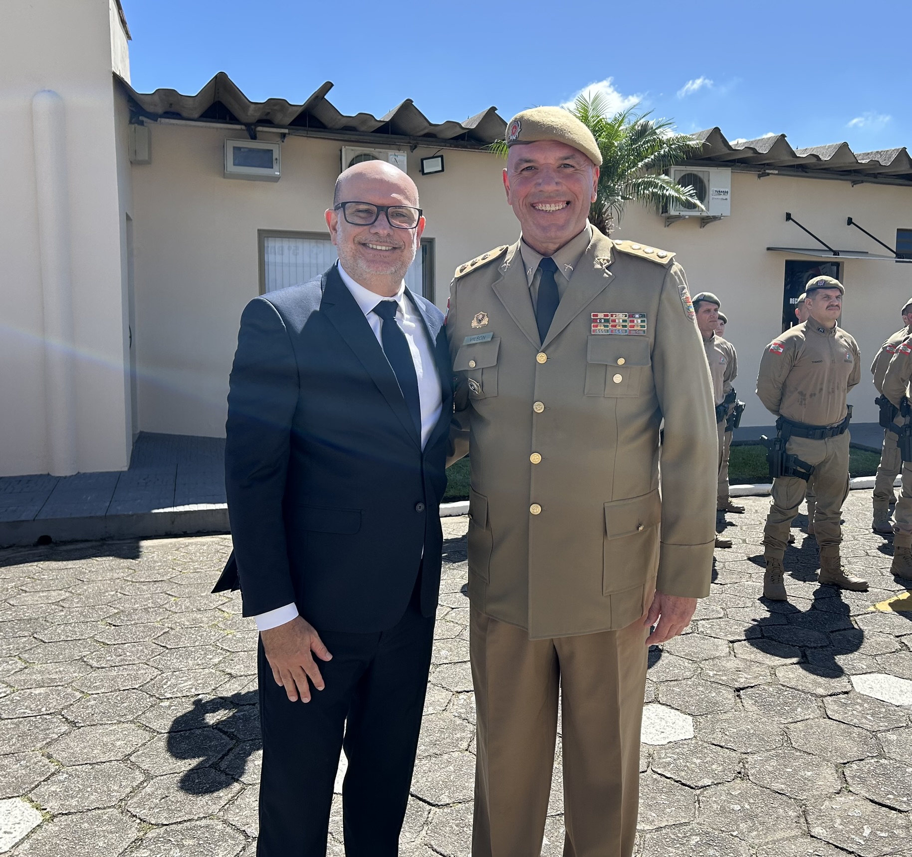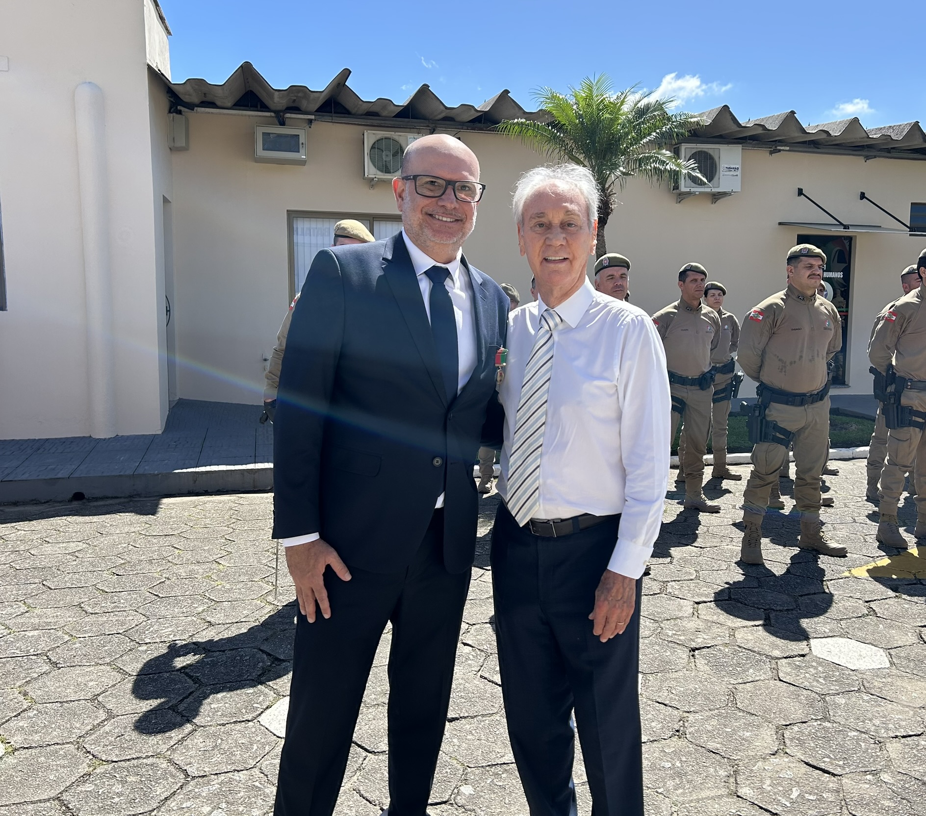 Em seu discurso durante o ato, o Comandante do 5º Batalhão, Tenente-Coronel Paulo Sérgio Pereira de Bona Portão, ressaltou alguns dos pontos que levaram à escolha dos homenageados: “O doutor Fred tem se mostrado parceiro estratégico da corporação, apoiando operações de combate à criminalidade, projetos de policiamento ostensivo e ações preventivas voltadas à comunidade, contribuindo de maneira efetiva para o fortalecimento da segurança pública e para a aproximação entre as instituições”.
