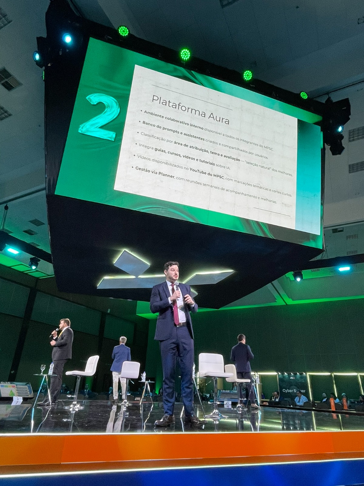 Na quinta-feira (16/10), último dia do evento, o Coordenador do Centro de Apoio Operacional Técnico, Promotor de Justiça Otavio Augusto Bennech Aranha Alves, falou sobre a plataforma Aura, em ambiente colaborativo para o compartilhamento de prompts, agentes e experiências com ferramentas digitais. A proposta foi de incentivar a troca de conhecimentos e a avaliação contínua de recursos úteis ao trabalho funcional.